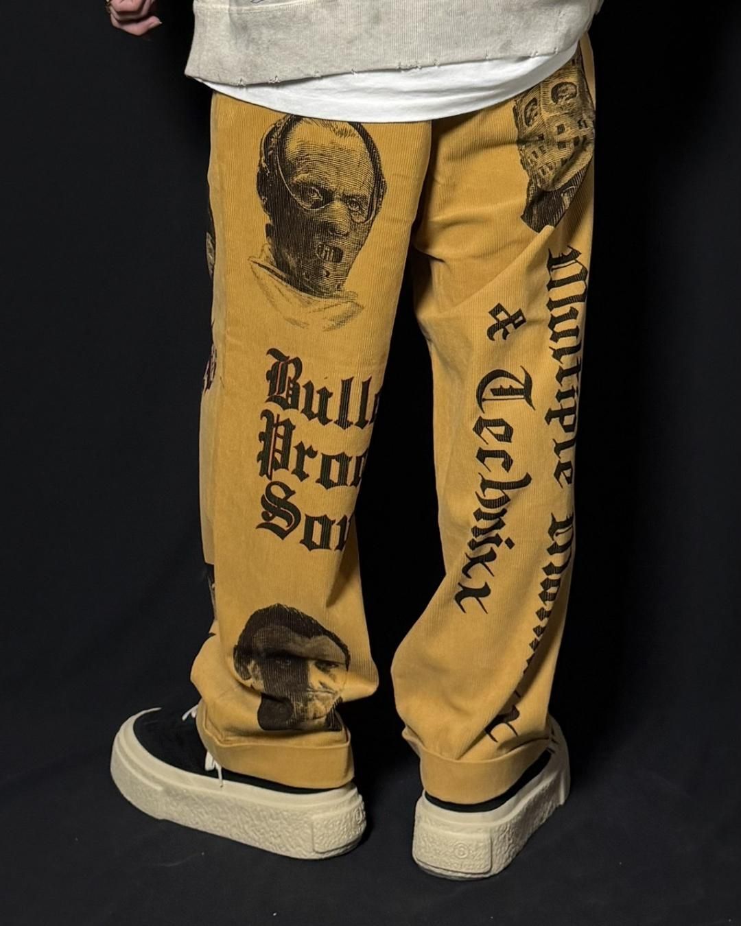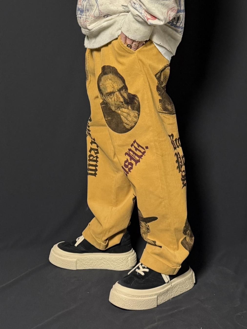 今季は、デザイナーと親交の深いアーティスト『NABSF』へ 依頼した悪役たちの名グラフィックを配し、アップデートしました。 1940年代~50年代に流行したヴィンテージメモリアルパンツを イメージして全てオリジナルのアートワークを落とし込んだ シルエットにも拘ったツータックコーズスラックスです。