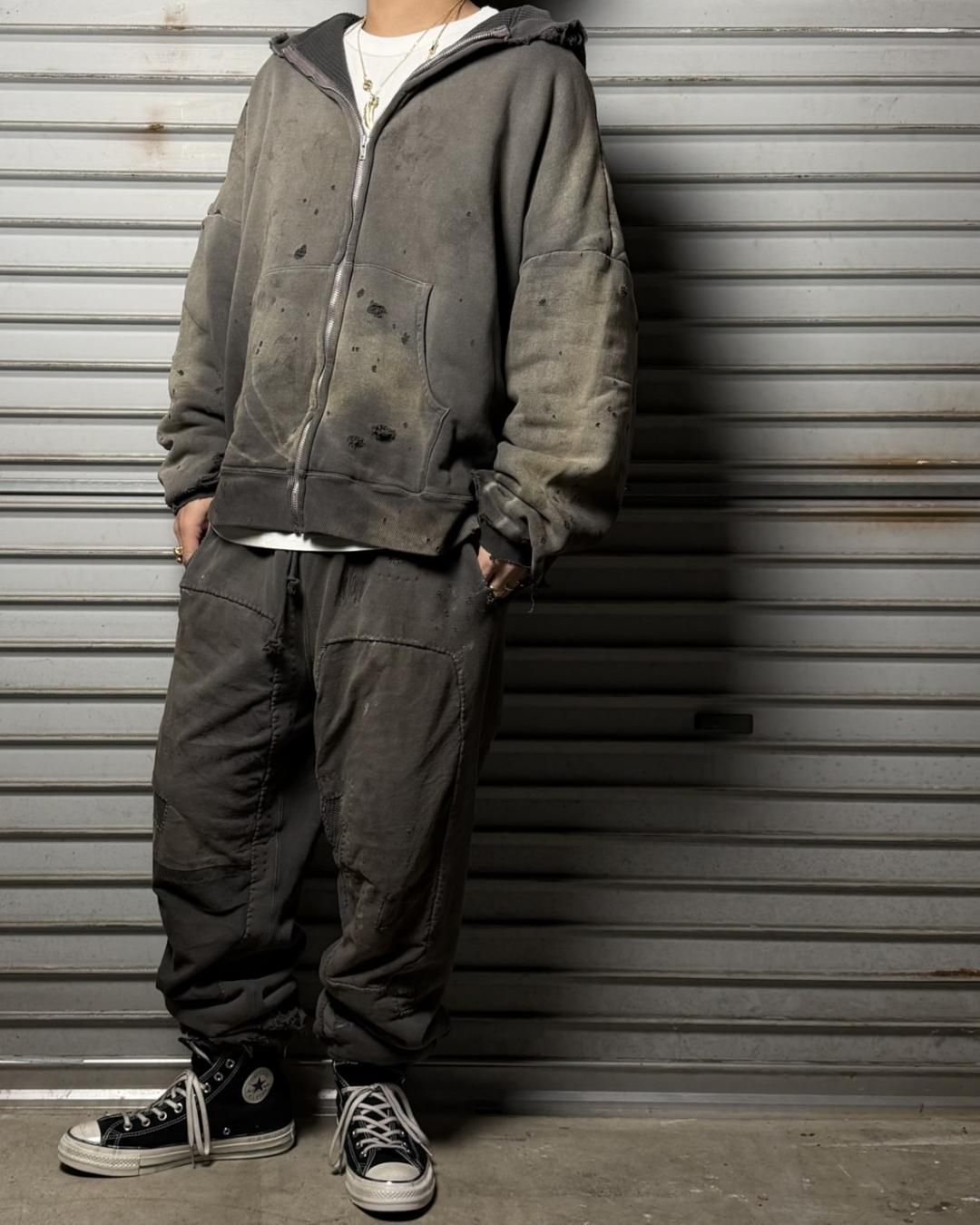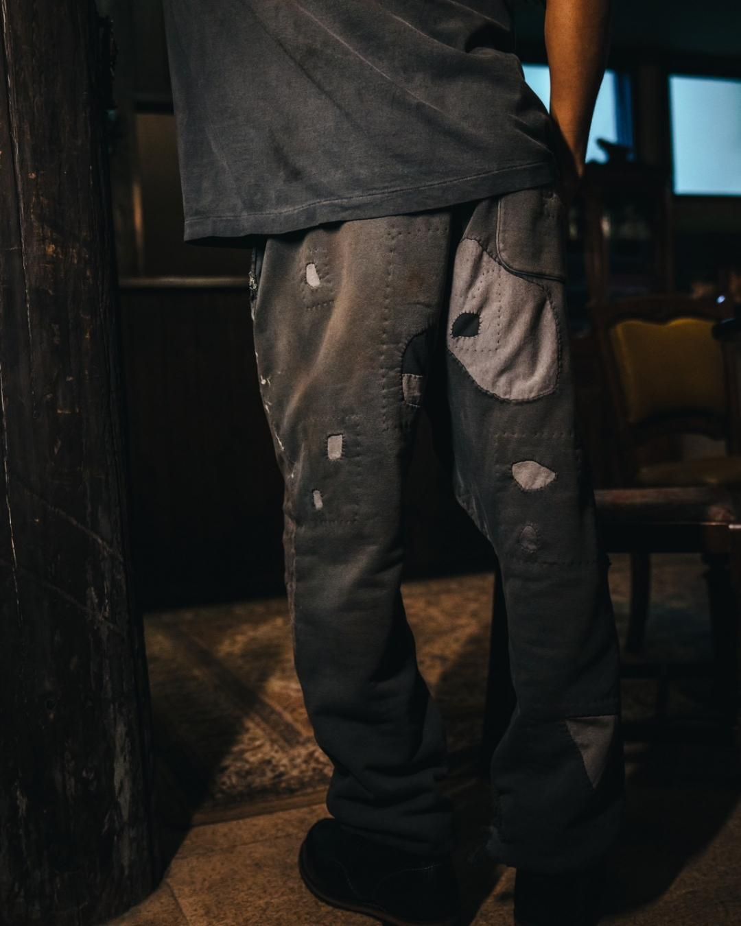 クラッシュ、ヴィンテージ加工がスウェットパンツと