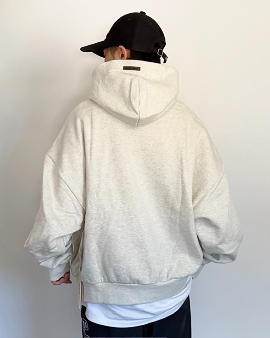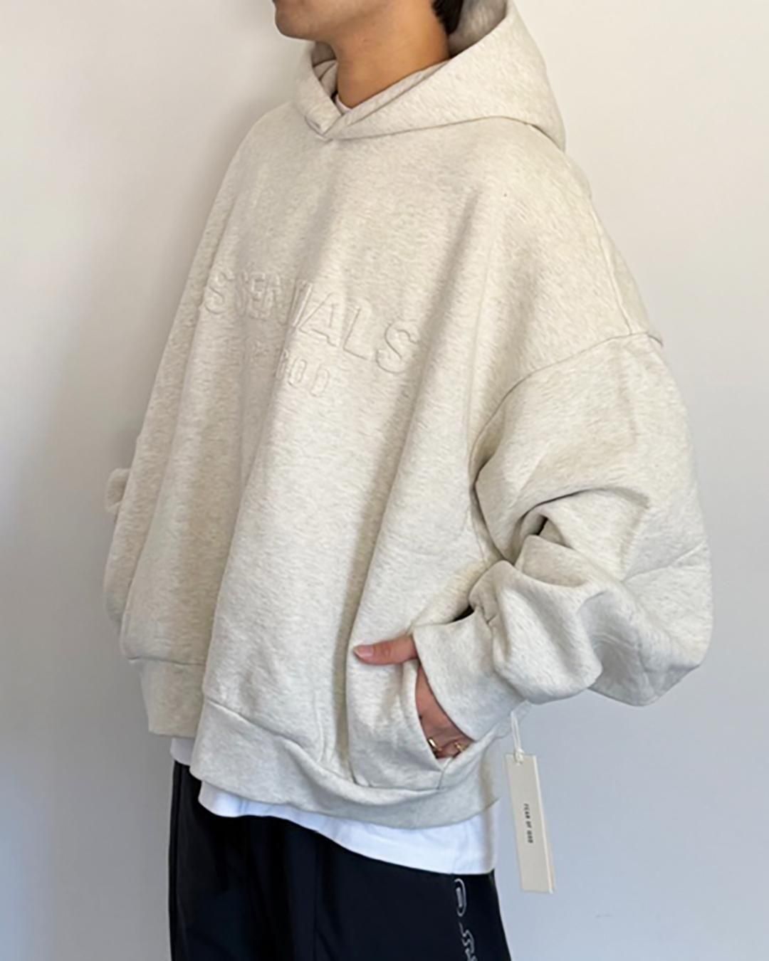 クラシックフーディーは、快適な着心地としっかりとしたシルエットを実現する厚手のフリース素材を使用しています。クラシックなフィット感と、Fear of Godらしいゆったりとしたシルエットが特徴です。フロントには、エンボス加工された「Essentials Fear of God」ロゴがあしらわれています。ダブルレイヤーフーディー、サイドポケット、リブ編みの袖口と裾、そしてフードには「Fear of God Essentials」のラバーラベルが縫い付けられています。